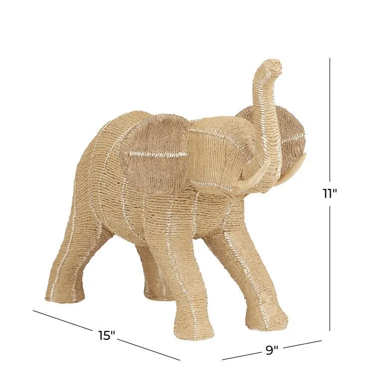 - This artistic elephant sculpture features an alert elephant with flapping ears and an upright trunk in a string woven textured pattern