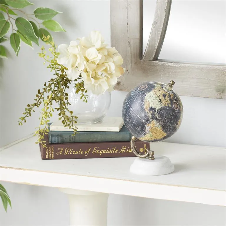 - Classic globe form with gridlines and an antique curved stand with a circular marble base