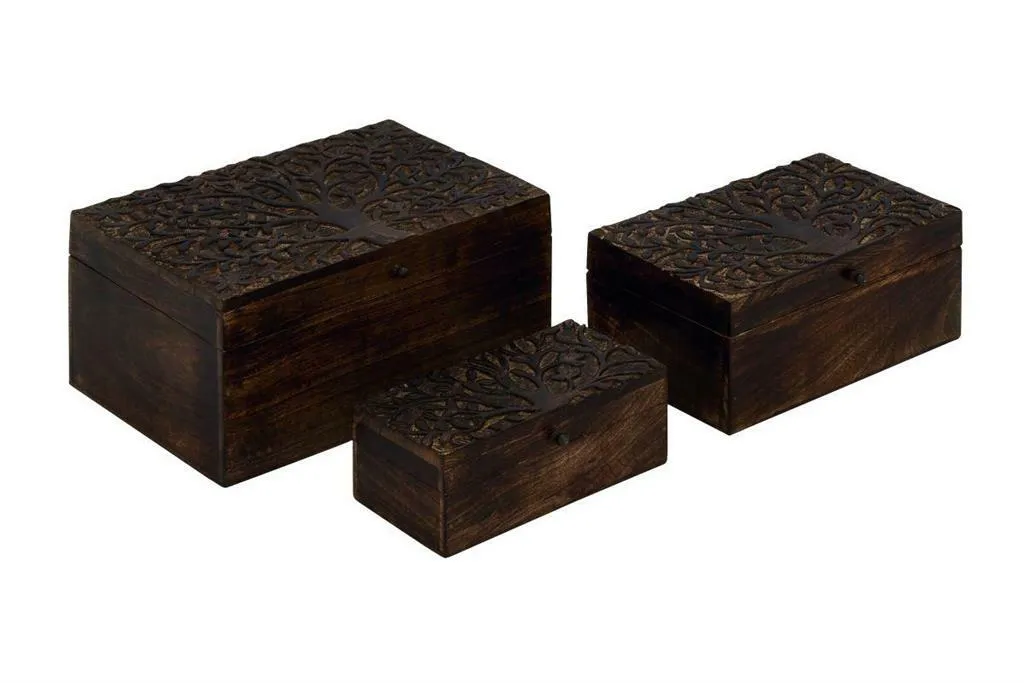 Let these accent piece boxes add a sense of style to your by displaying them on top of a shelf, countertop, mantel, or an accent table. Whether it's jewelry, or knickknacks, let these boxes guard your treasure. Arrange these decorative boxes as standalone or as a set of accent pieces or home decors. Due to the handmade nature of this item, no two will be alike, there will be slight differences in shape, size, and color. Designed with black rubber stoppers at the base that prevent scratching furniture and table tops, as well as sliding around. This item comes shipped in 1 carton. Due to the handmade nature of this item, no two will be alike, there will be slight differences in shape, size, and color. Suitable for indoor use only. Made in India. Each set comes with 3 stylish rectangular boxes. Rustic Design. Wood box makes a great gift for any occasion.