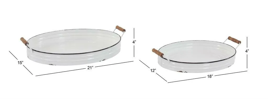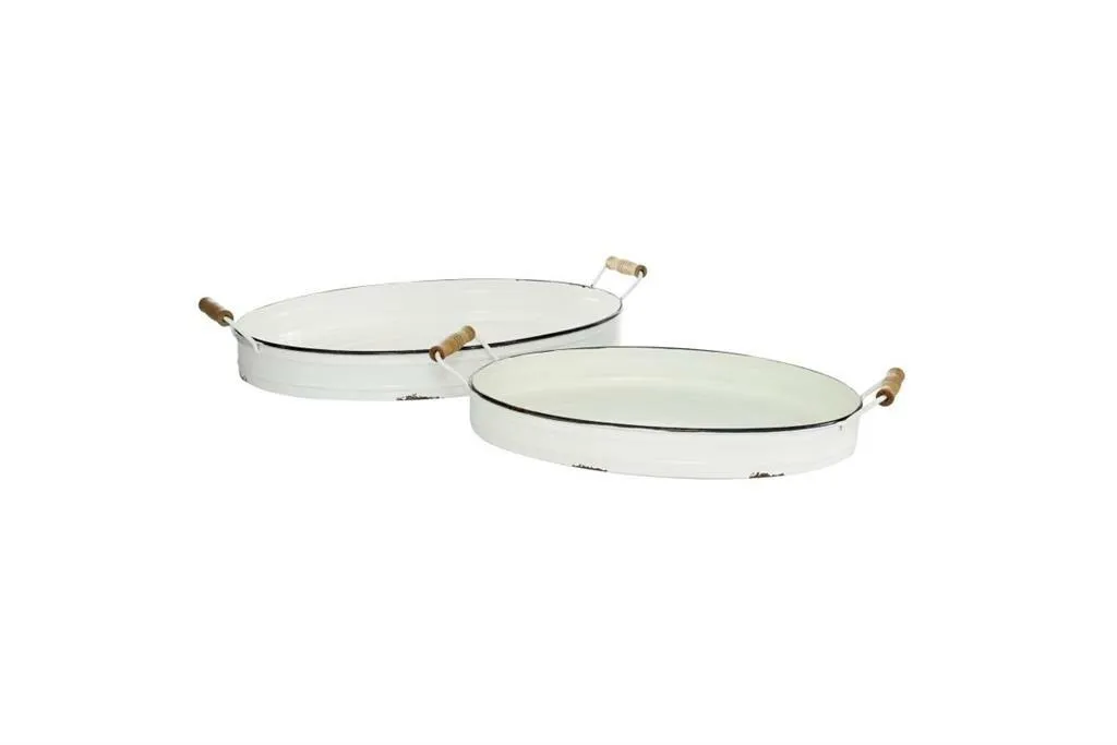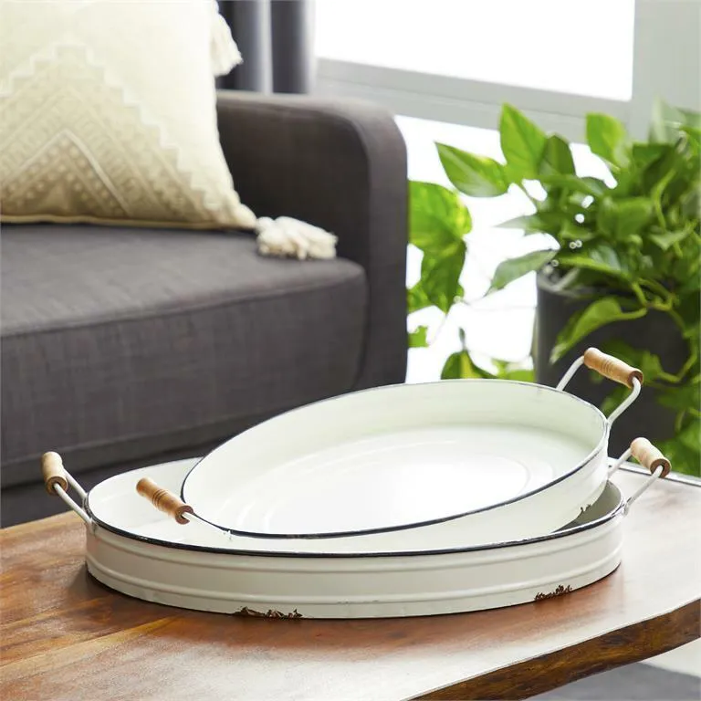 - These 2-set white display trays showcase an oval shape with upright wooden brown handles and a black top rim tray design