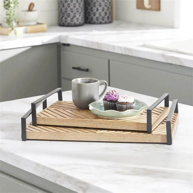 Stylize your dining experience with this farmhouse brown wooden serving tray set with ribbed design and iron handles. Each rectangular tray is crafted from wood and highlights diagonal ribbed patterns with natural brown finish and 2 conveniently placed iron handles. Use as individual or set serving trays or as decor of holders for your coffee, console, and kitchen tables, these decorative wooden trays are sure to make a charming statement in your farmhouse-themed home. Please note that this item is for decorative purpose use only and are not food safe. This item ships in one carton