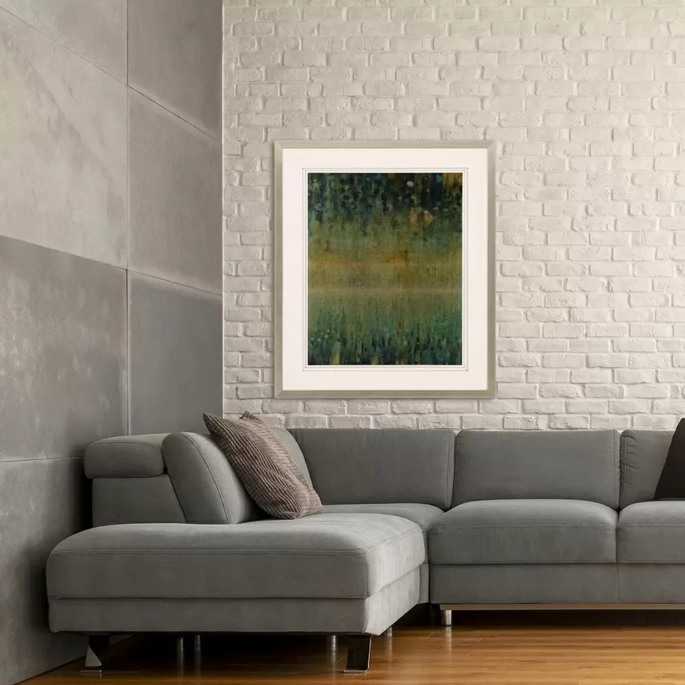 Giclee embossment on metallic paper. Framed in a modern antique silver wood with painted black edge.