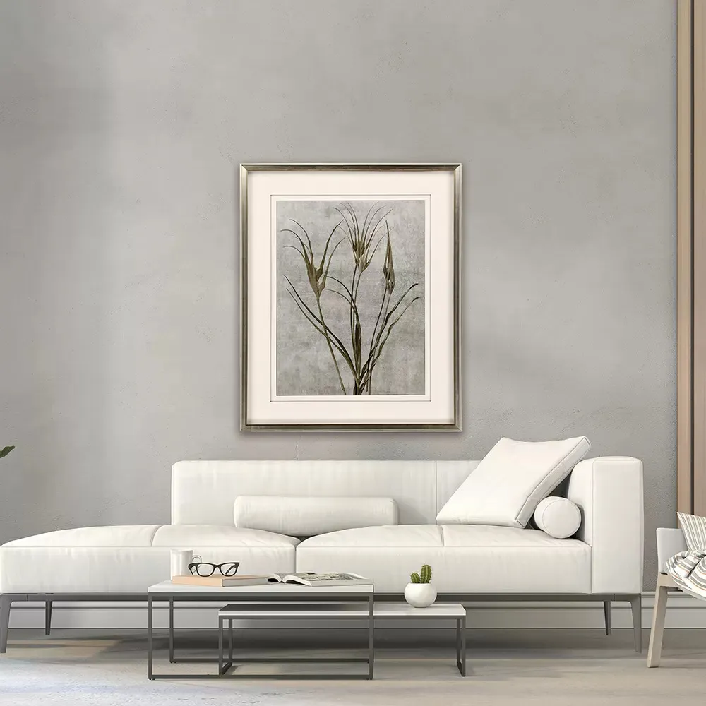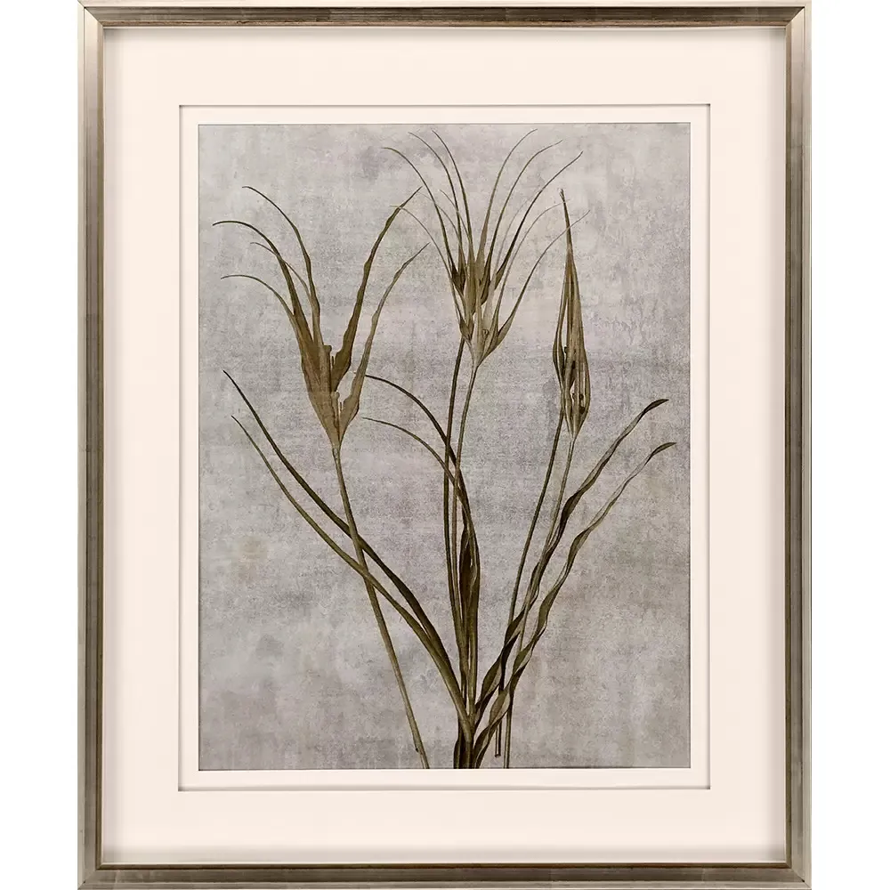 Mixed media giclee on metallic paper. Framed in a silver leaf wood shadow box style molding with gold wash edging and black side.