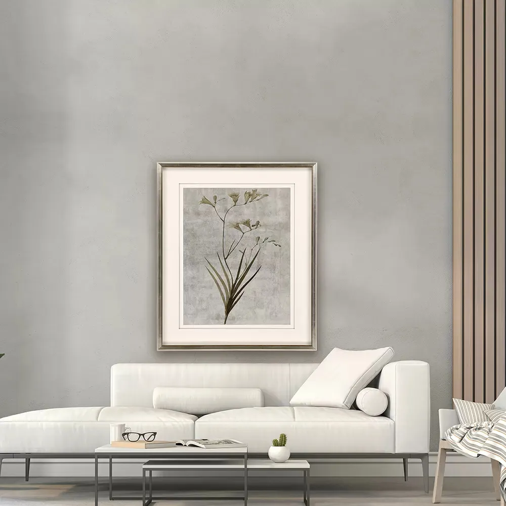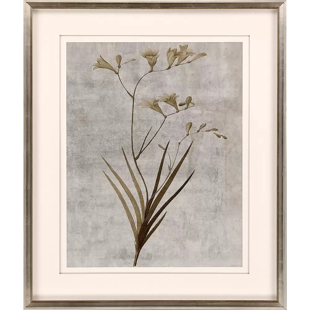 Mixed media giclee on metallic paper. Framed in a silver leaf wood shadow box style molding with gold wash edging and black side.
