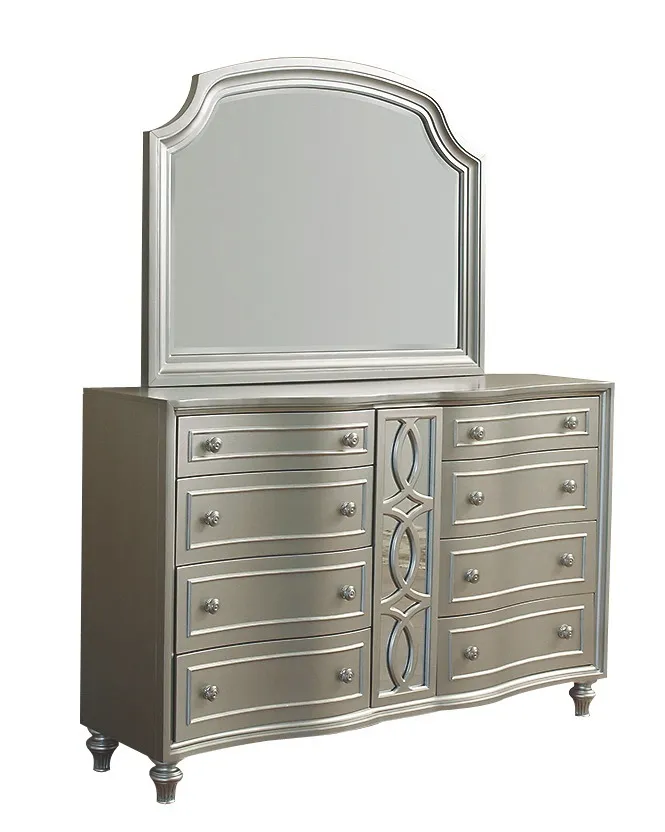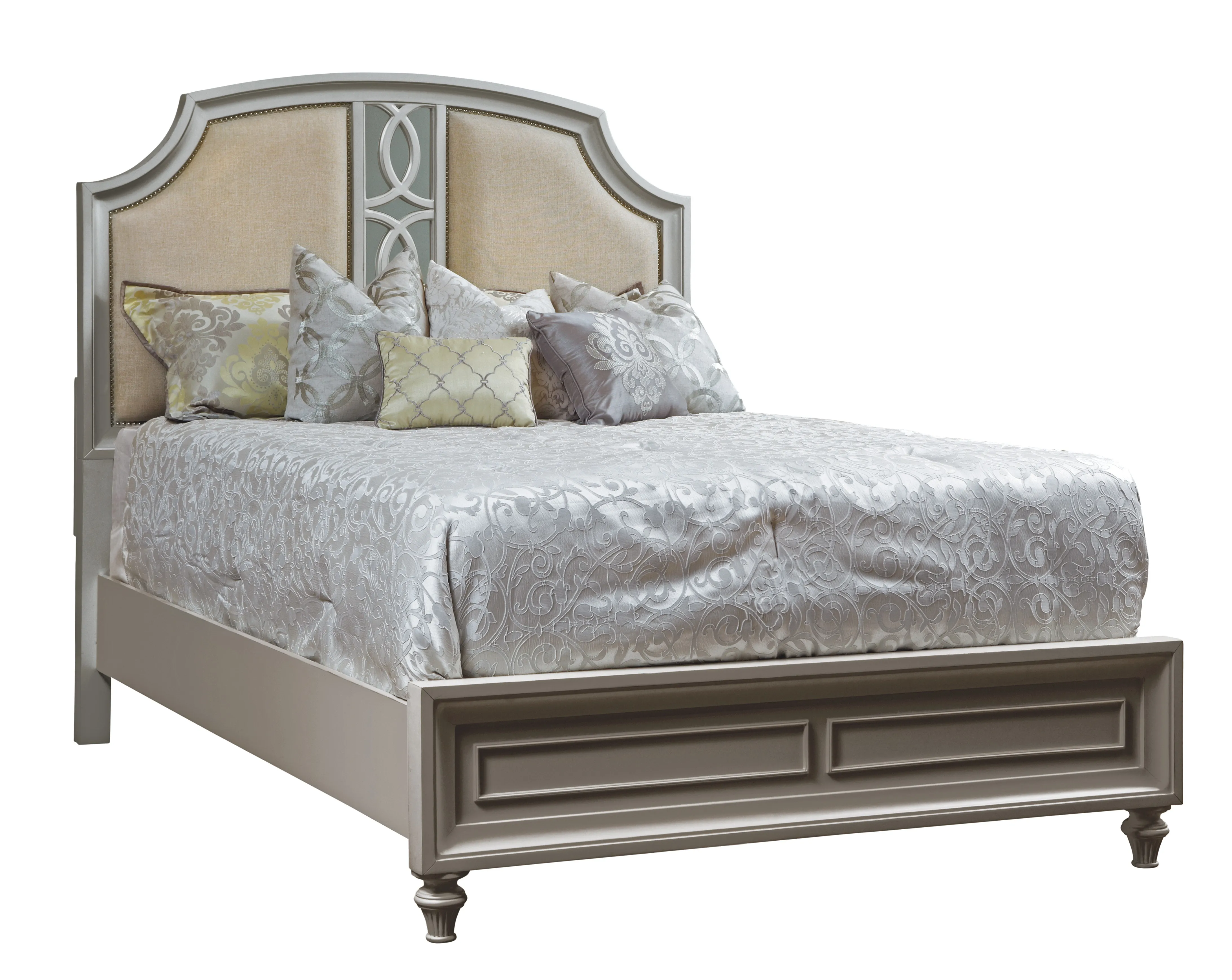 Make a statement with the pearlized silver finish of Regency Park. The traditional lines of each design in this collection are paired with hints of beguiling Hollywood Regency flare. Storage pieces feature bow and serpentine fronts, while the upholstered bed is highlighted by nailhead trim and a central mirror-backed decorative-pierced vertical molding. Drawer interiors are done in Avalon RegencyTM Red which cre- ates a bold and beautiful statement. Enjoy timeless elegance paired with contemporary style.