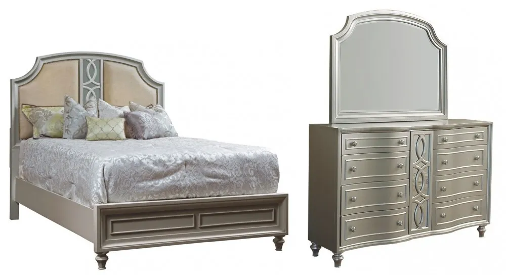 Regency Park 3 PC King Bedroom Set - Silver includes king bed, dresser, & mirror.