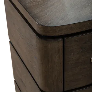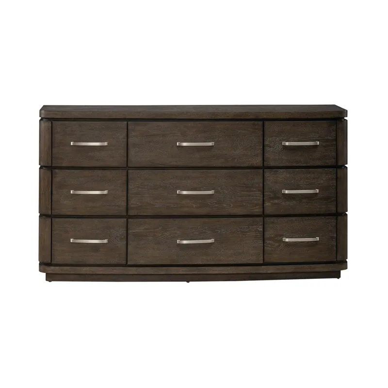 Elevate your bedroom dƩcor to new heights of sophistication and comfort with the Cascade Falls 9 drawer dresser. Crafted with excellence using Rubberwood solids and Split Heart White Oak veneers, this dresser features a Satin Espresso finish. The bow shaping of the dresser adds a touch of soft contemporary flair, infusing the piece with graceful curves and understated charm. This subtle design element creates a sense of harmony and balance, enhancing the overall aesthetic of your bedroom space. Atop the dresser, a stunning starburst veneer pattern steals the spotlight, adding visual interest and sophistication. This intricate detail showcases the dresser's impeccable craftsmanship and attention to detail, making it a focal point of any room. Adding to its architectural appeal, reveal sections on the front and sides of the dresser offer glimpses of the finished frame, creating dimension and interest. These subtle accents elevate the dresser's design, making it a true work of art. Designed for both style and functionality, this dresser features soft-closing drawer guides for a gentle touch, ensuring smooth and quiet operation. The top drawers are lined with premium felt to protect delicate items, while the bottom drawers feature a cedar panel to keep your clothes fresh and fragrant. The drawers are accented with a custom Satin Nickel bar pull hardware. Softly rounded pilasters flow seamlessly into the inset bow-shaped plinth base, creating a cohesive and elegant look. The Cascade Falls 9 drawer dresser is a testament to refined craftsmanship and impeccable design, making it the perfect addition to any bedroom decor.