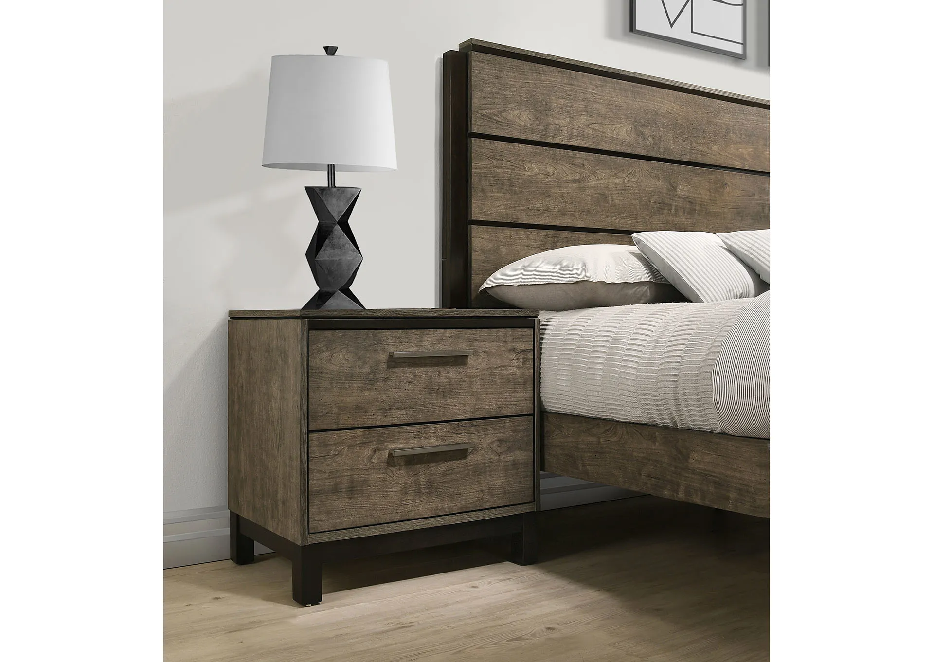 Who says fresh new Uptown styling has to cost more. This exciting new casual contemporary bedroom is attractive & affordable. The two-tone group offers a durable truffle cherry & ebony 3-D laminate finish combination that will withstand the test of time. All cases feature black felt top drawers & snag free interiors to offer plenty of storage for any of your needs.