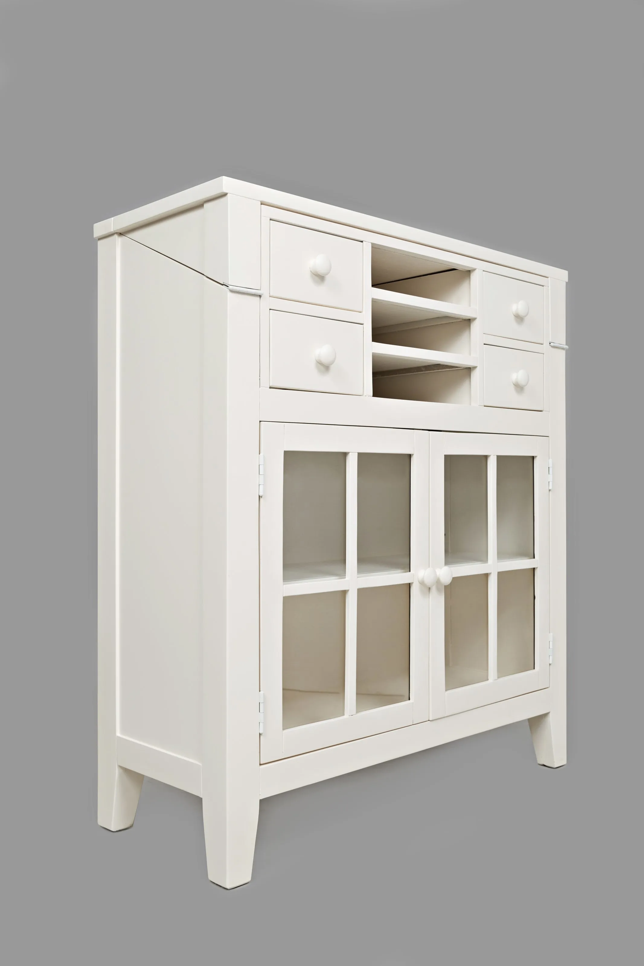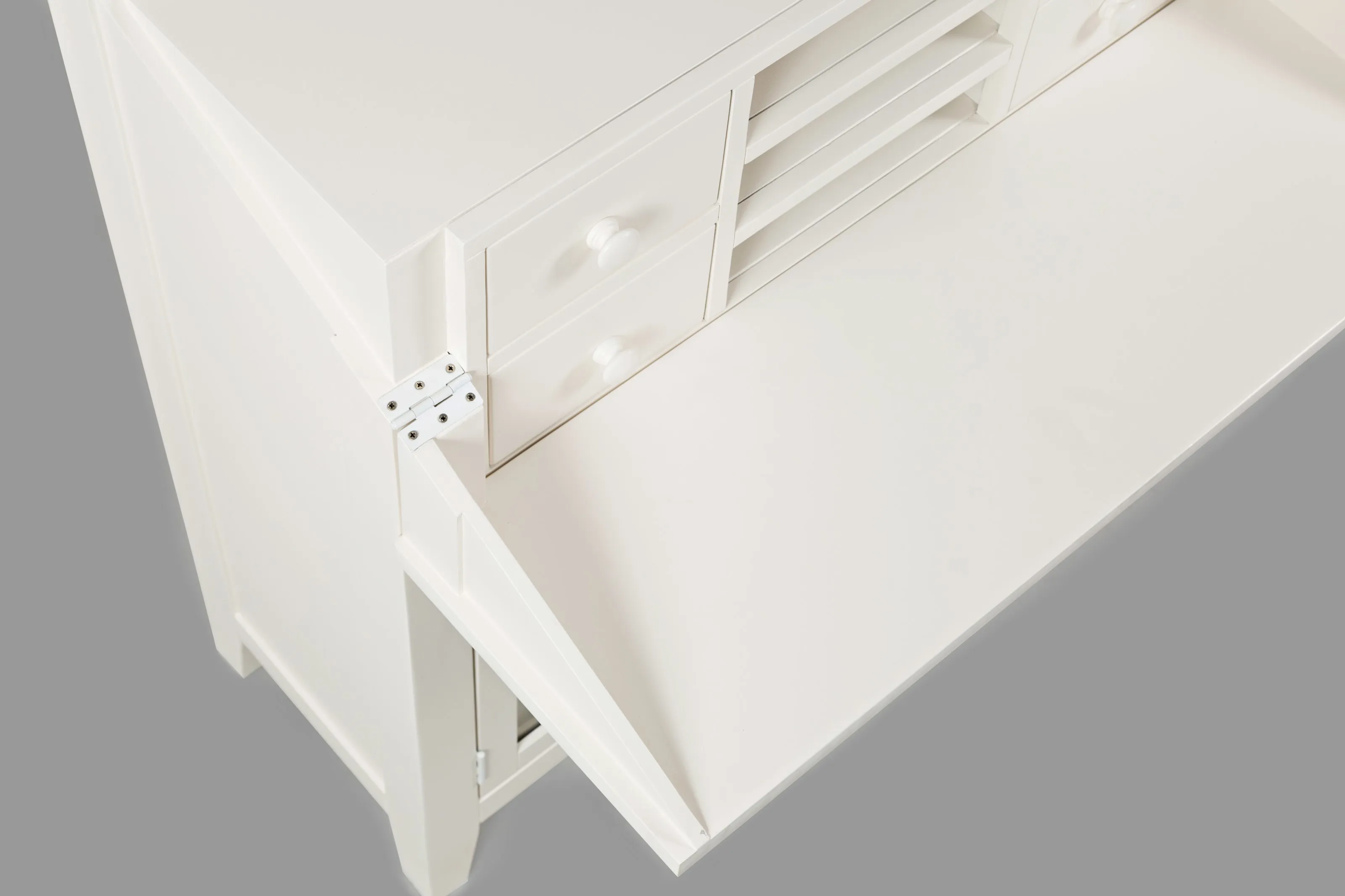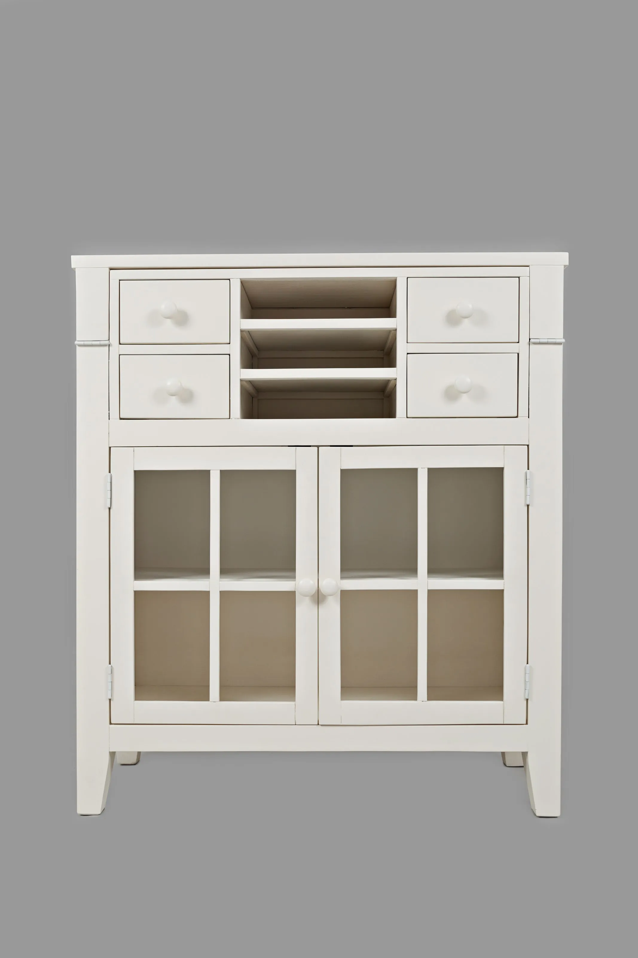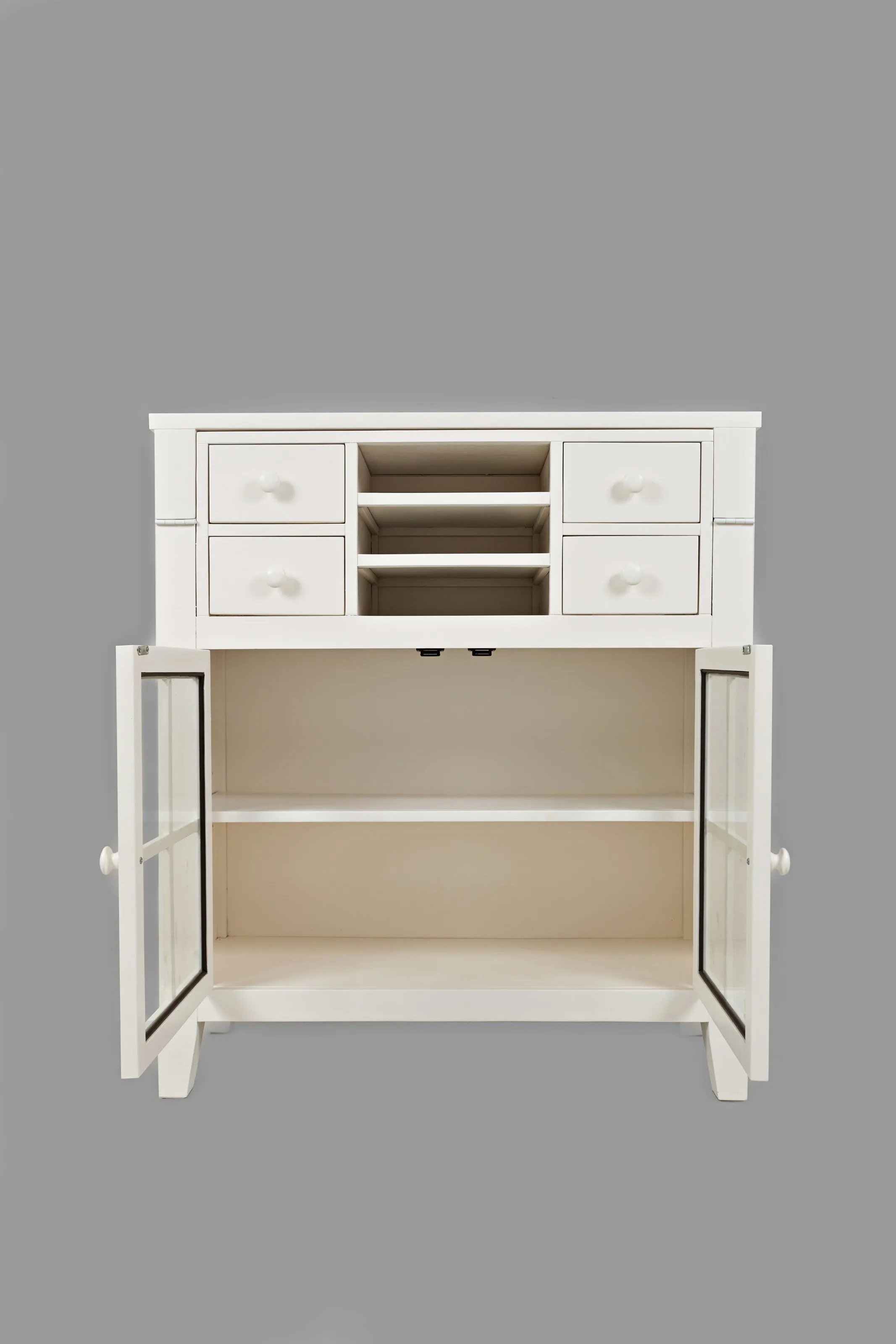 Quality workspace is often in short supply at home. Let us do something about that with this accent desk. This fliptop desk has a thin profile (15"!) when the desk top is put away, but offers a fantastic work space when the desk top is down. With space for letters, pens, and other small office things -as well as a beautiful display space behind glass doors- this piece will bring you the home office you didn't know you could have. Writing surface: 35.5" x 12.5". Drawers Dimensions: 6.5" x 11 x 3. Letter boxes: 12" x 13.5" x 3". Cabinet Opening Dimensions: 32" x 21.5". Interior Shelf Dimensions: 35.75" x 13.25. Adjustable interior shelf sits at 8.75/10.5/12.5" heights.