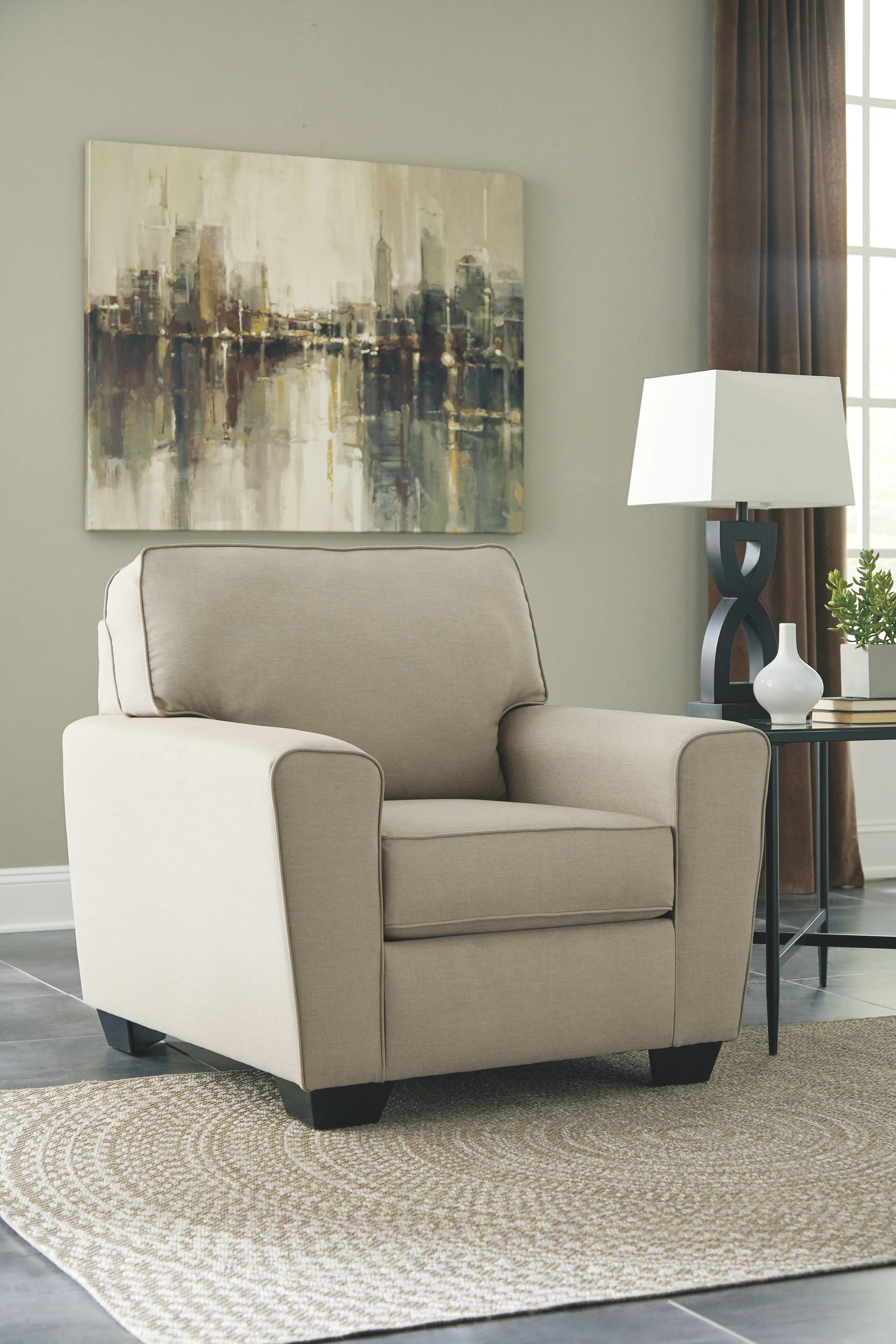 You've got a friend to lean on with this chair. Covered in sleek, cream-colored woven upholstery, it has a relaxed contemporary vibe. Sit back and lean into wide tapered arms. Neutral color sets the scene for seasonal home decor.