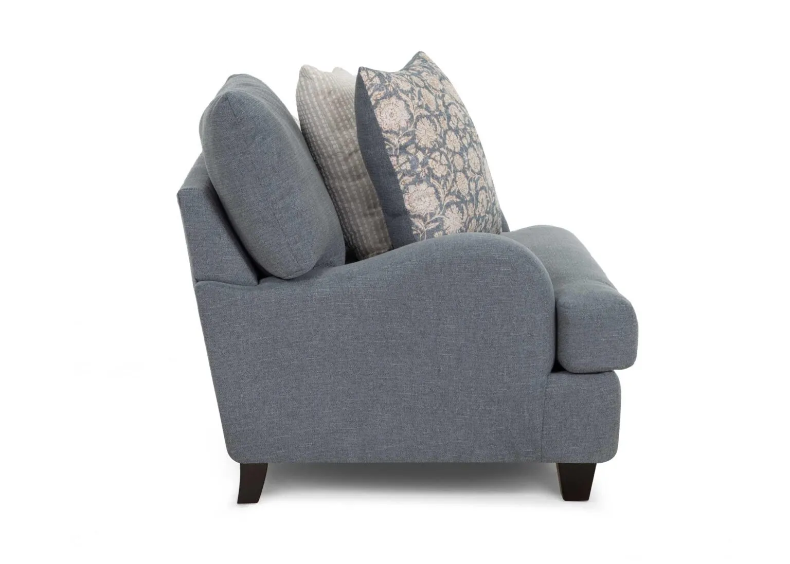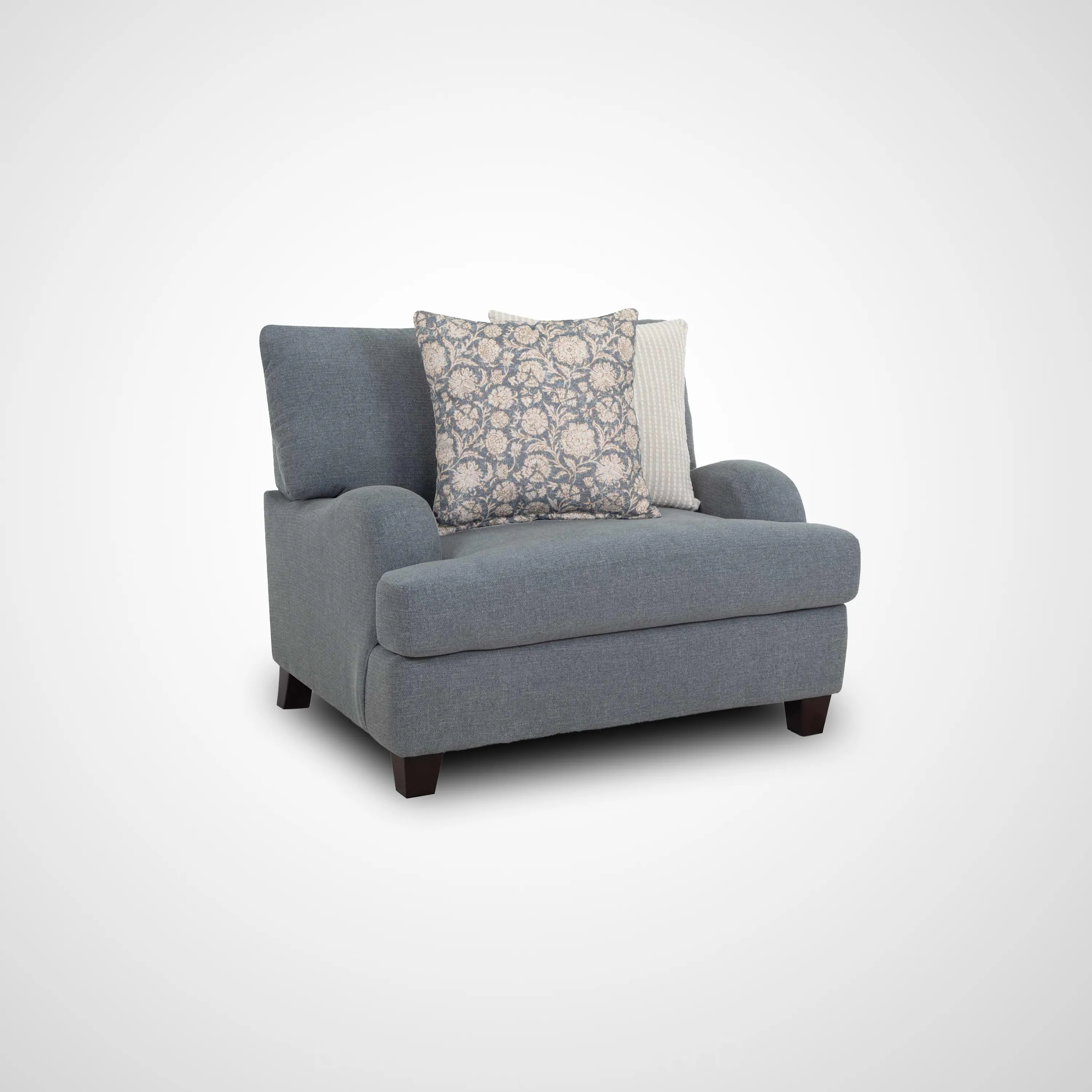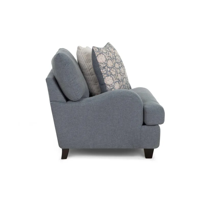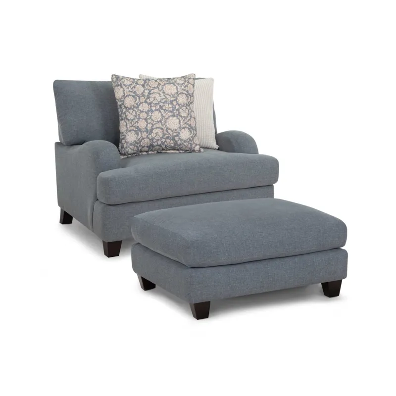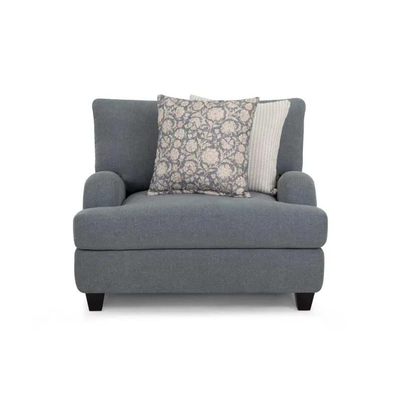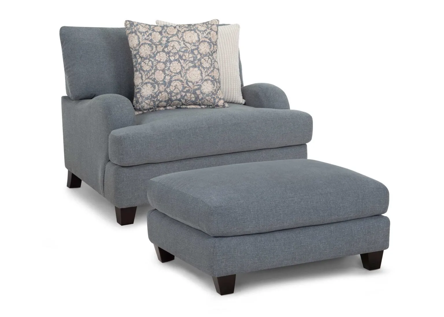 Timeless elegance meets everyday comfort in the 992 Laurel Collection. This inviting collection includes a sofa, loveseat, chair and a half, and a matching ottoman. All pieces upholstered in a durable gray-blue fabric. Coordinating throw pillows in timeless patterns and soothing hues enhance the aesthetic, adding a touch of warmth to the group. Solid wooden legs complete the look and offers support and a polished finish.