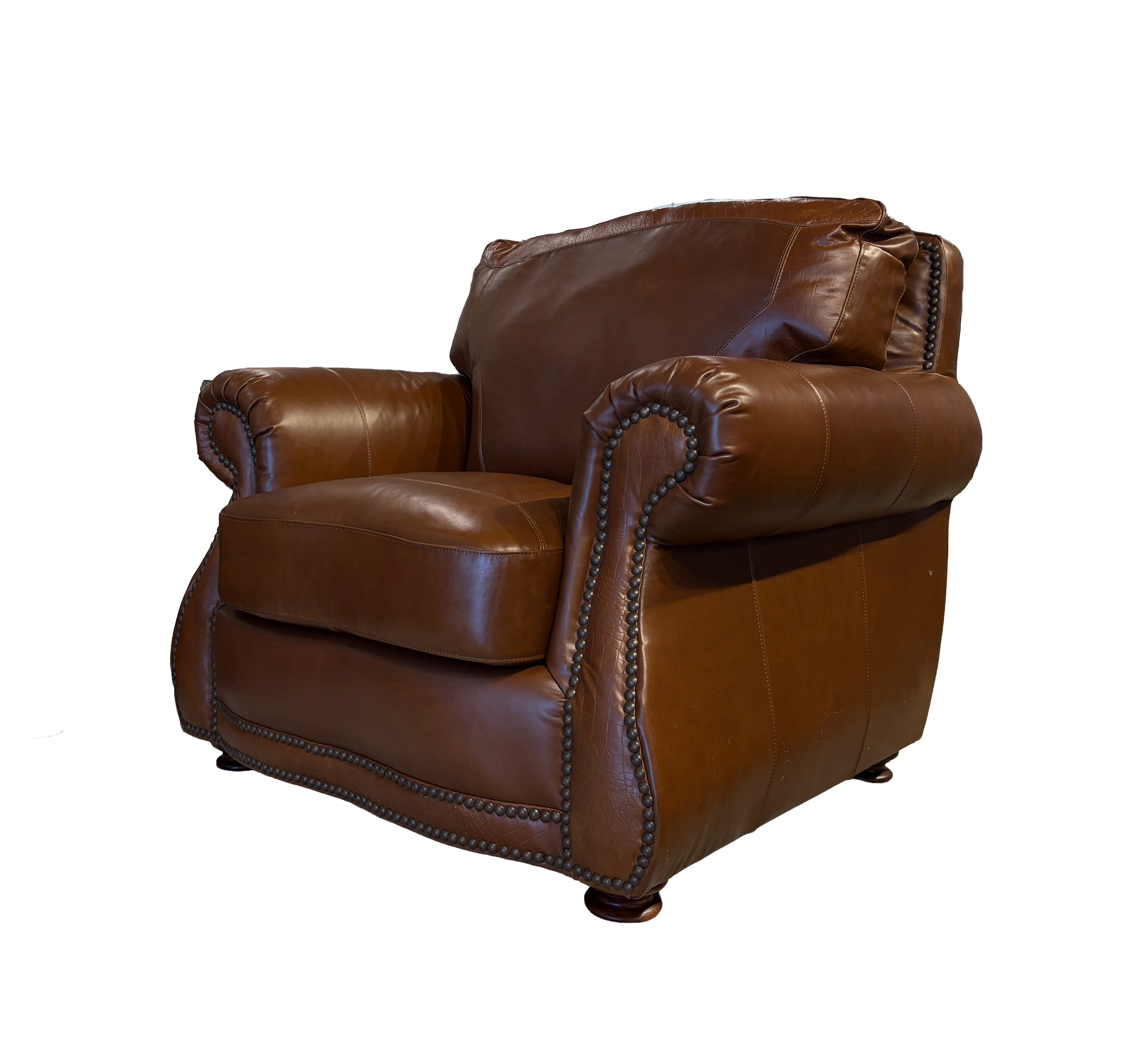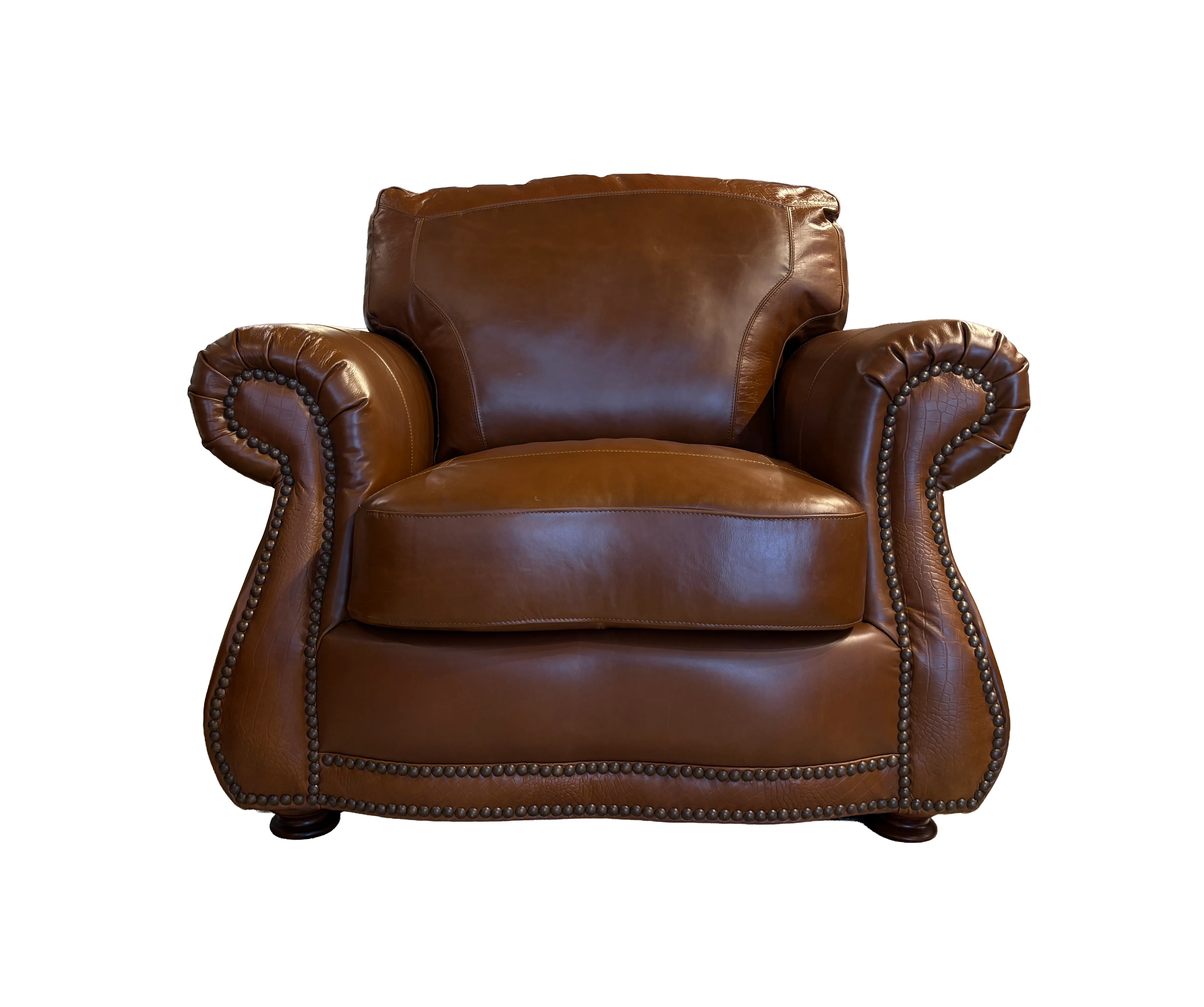 The 9055 features a rolled arm and a high back with alligator embossing on the back pillows, front rail and stump panel. Nailhead trim across the stump panel, back, and front rail completes the look. Stocking Color: Brandy with Alligator All of our products come standard with: True 8-way hand tied coil spring construction, providing more balance for comfortable seating 100% top grain leather upholstery all over Genuine down-blend seat pillow tops Individually muslin wrapped coils nestled in each seat cushion for coil on coil comfort and longevity Zipper access on all cushions Zipper access on back cushions Velcro stabilizers for seat adjustment We sell to the trade only. Please visit your local retailer for pricing and availability.