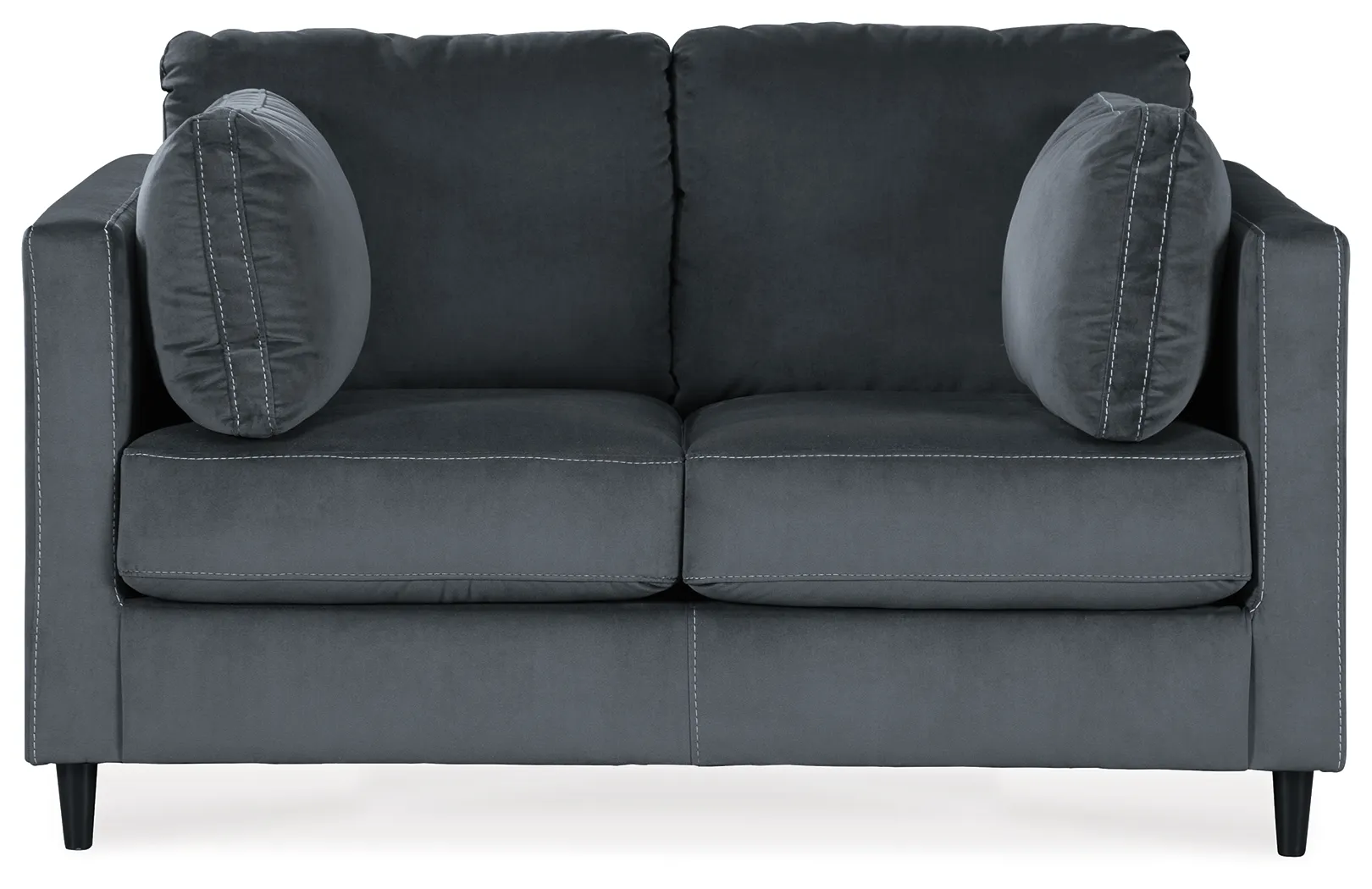 Melding the contemporary style you love with the cozy feel you crave, the this loveseat turns easy living into an art form. The loveseat's ultra-linear frame is enriched with generous bolster arm pillows and an indulgent velvet upholstery that's the stuff dreams are made of. Slim track arms, sleek tapered feet and distinctive accent stitching are among the finer details that set this loveseat apart.