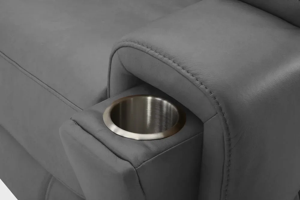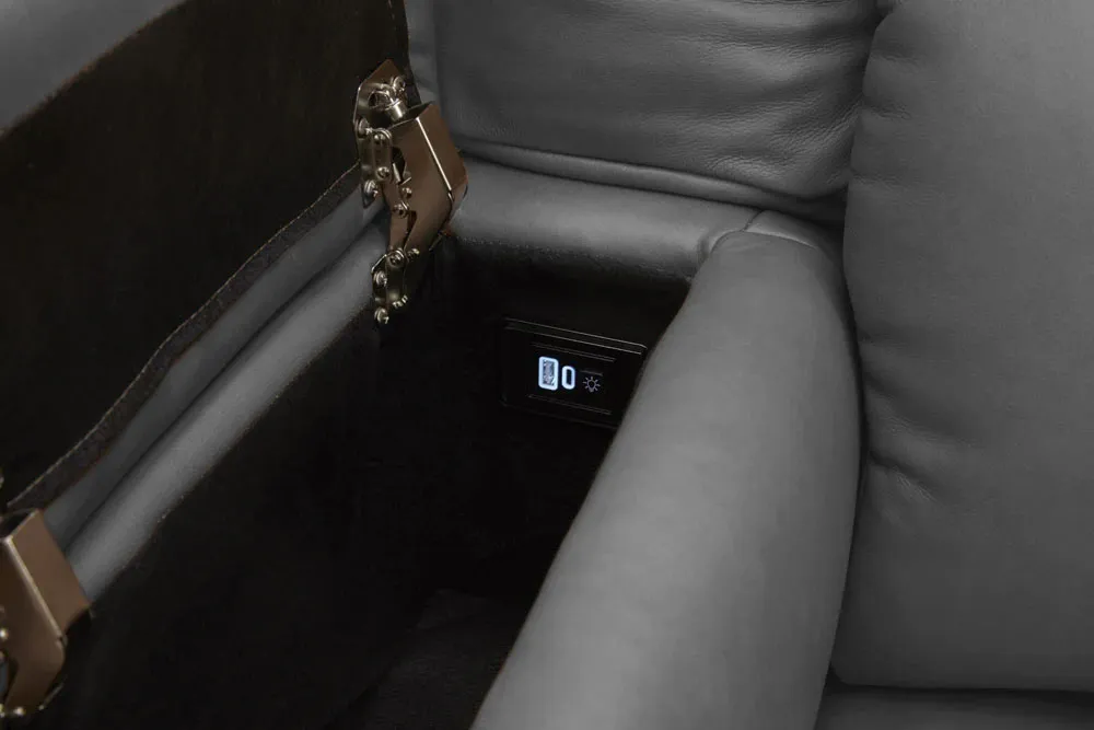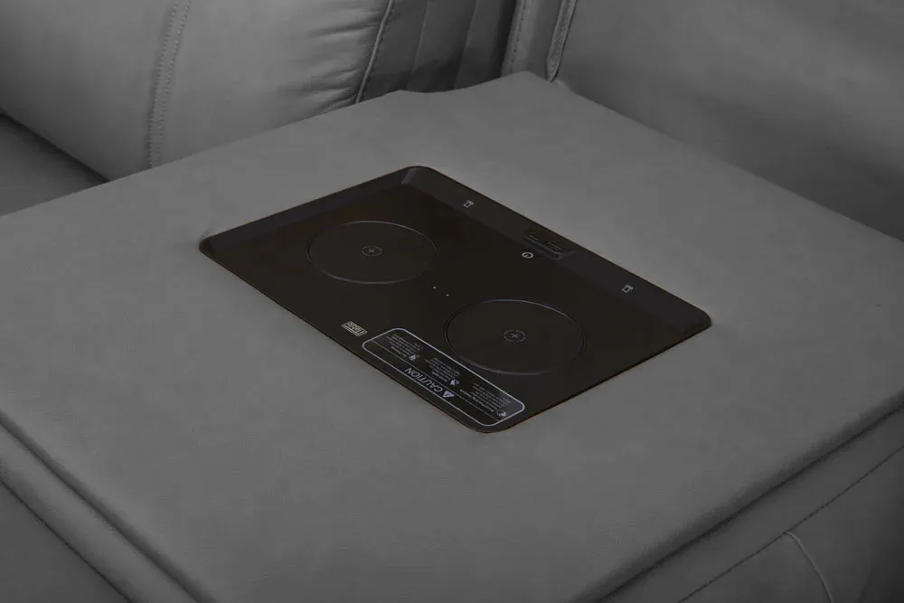 Sofa has a POWER Dropdown table with power cup holders to adjust for sizes and USB Ports