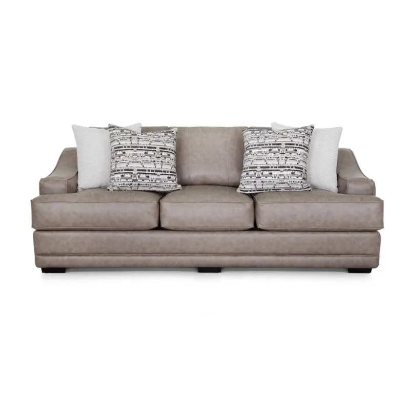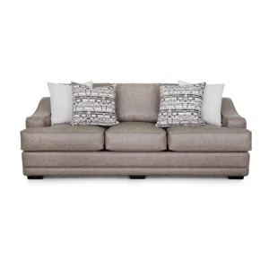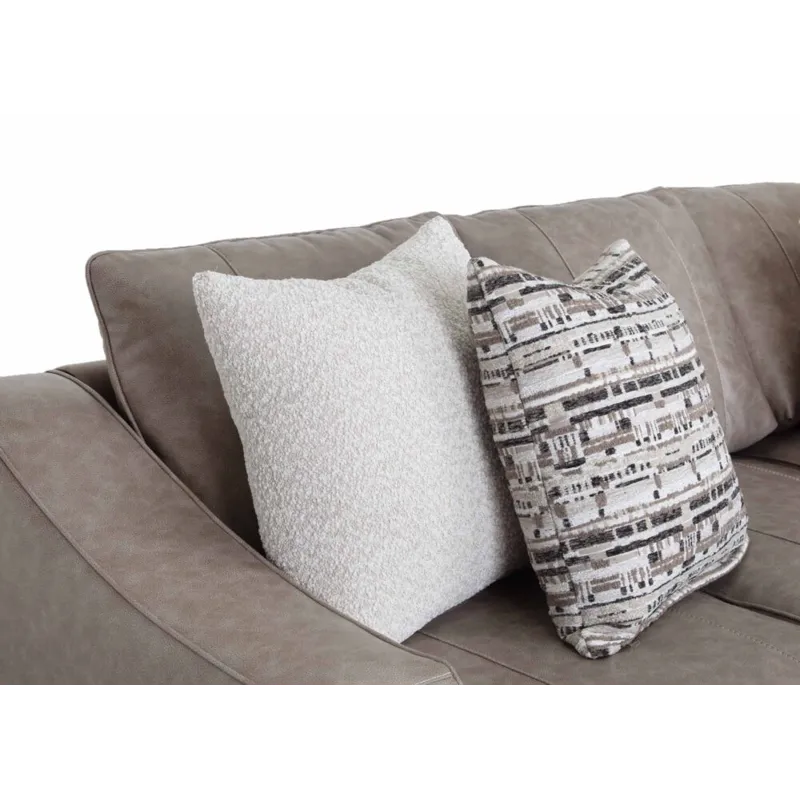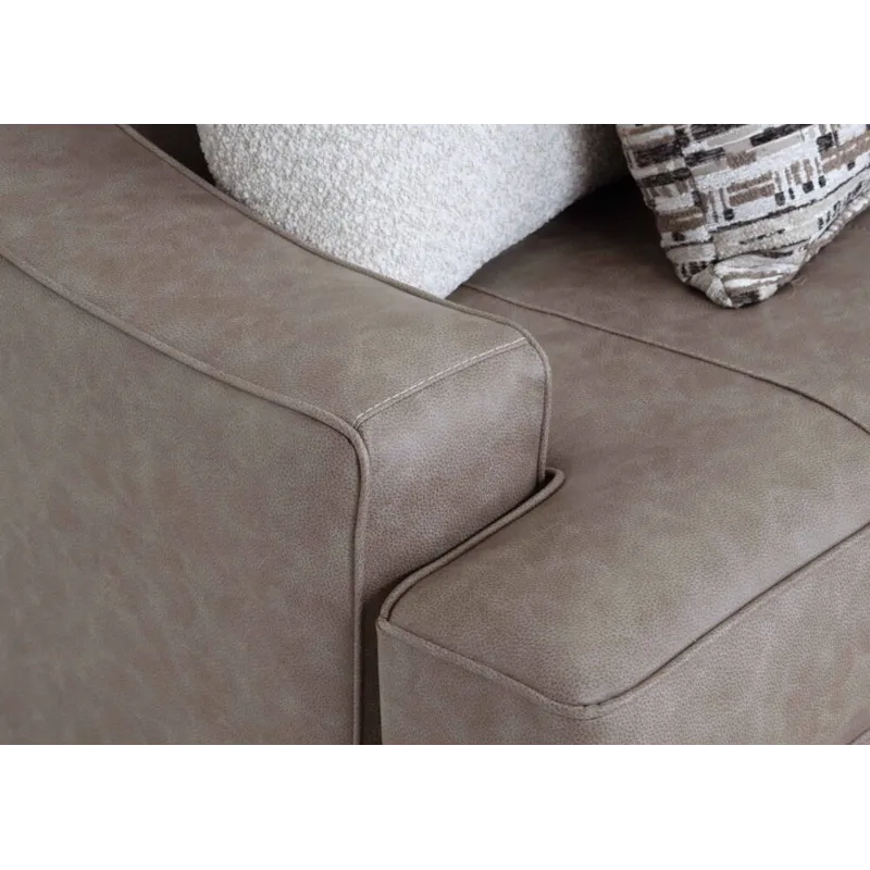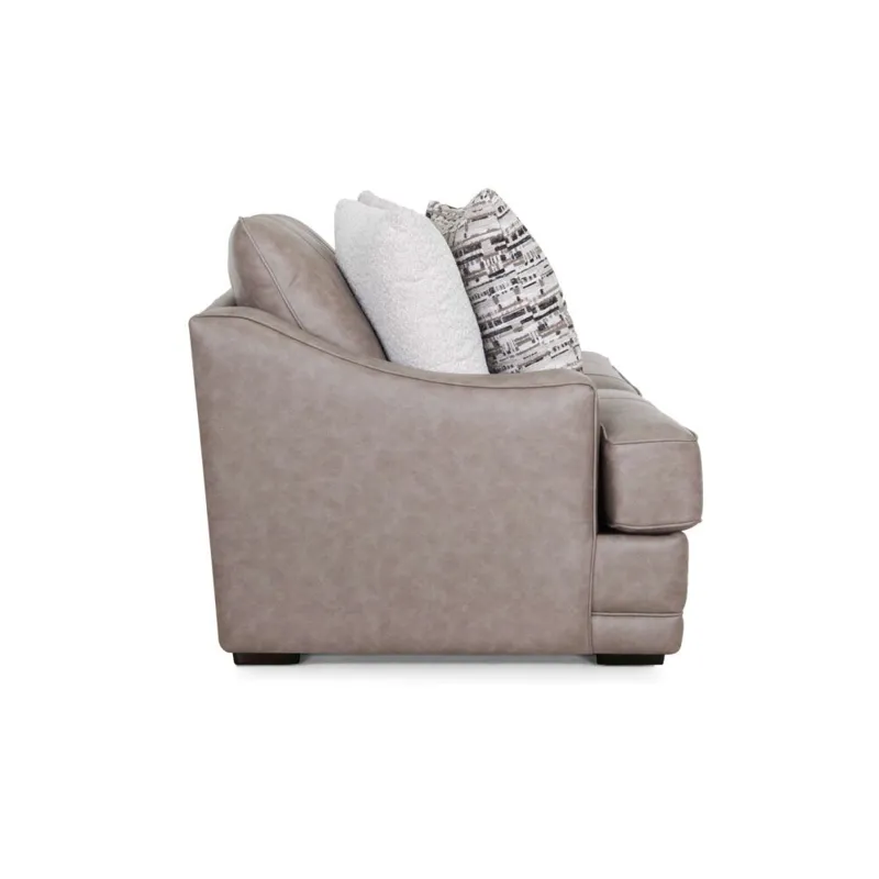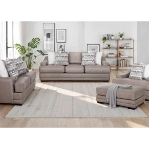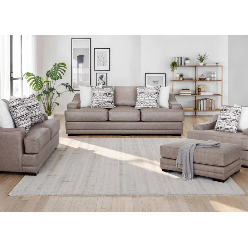The 893 Granger Collection is designed to make a bold statement of comfort and style in your living space. This large-scale sofa group includes a sofa, loveseat, chair and a half, and matching ottoman. All pieces are crafted from premium greige fabric that emulates the inviting look of leather, combining sophisticated charm with a soft, luxurious feel. Coordinating throw pillows are included, adding a touch of texture and visual dimension. With its deep cushions and overstuffed backs, the Granger Collection invites you to sink in and unwind. The padded inset slope arms with elegant, mini piecrust welting add a touch of timeless sophistication, while the solid wooden legs provide sturdy support and a refined finish.