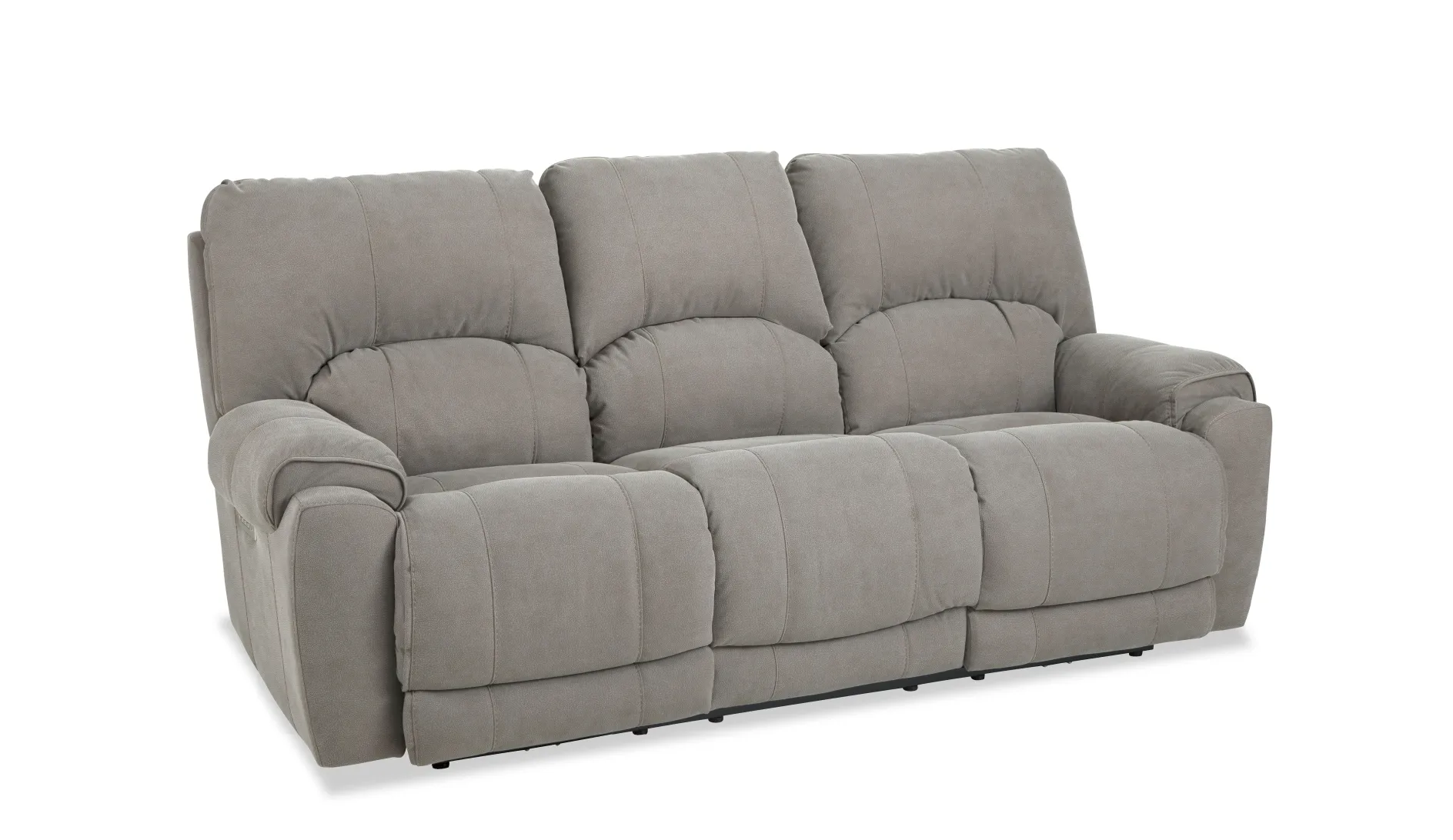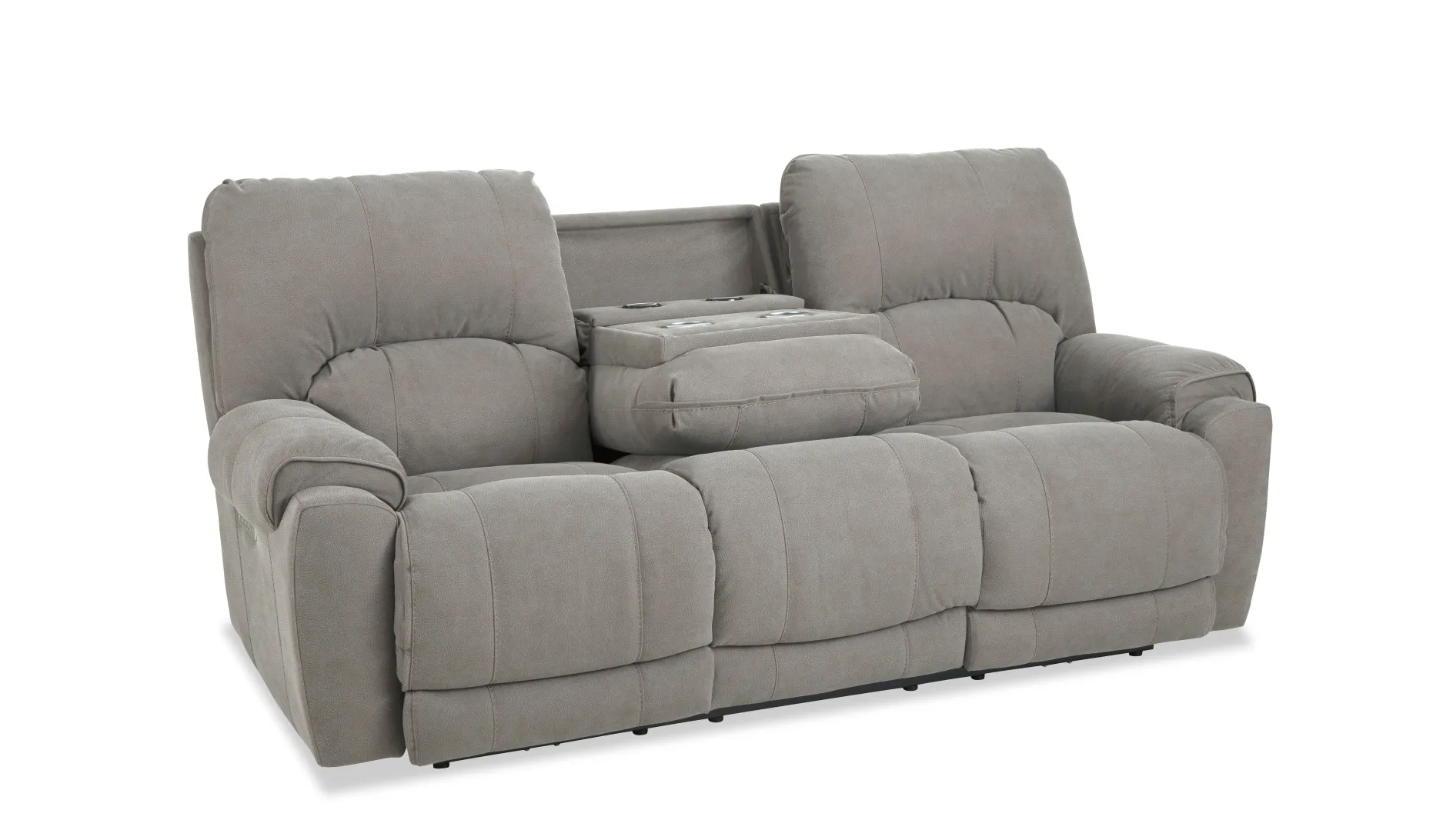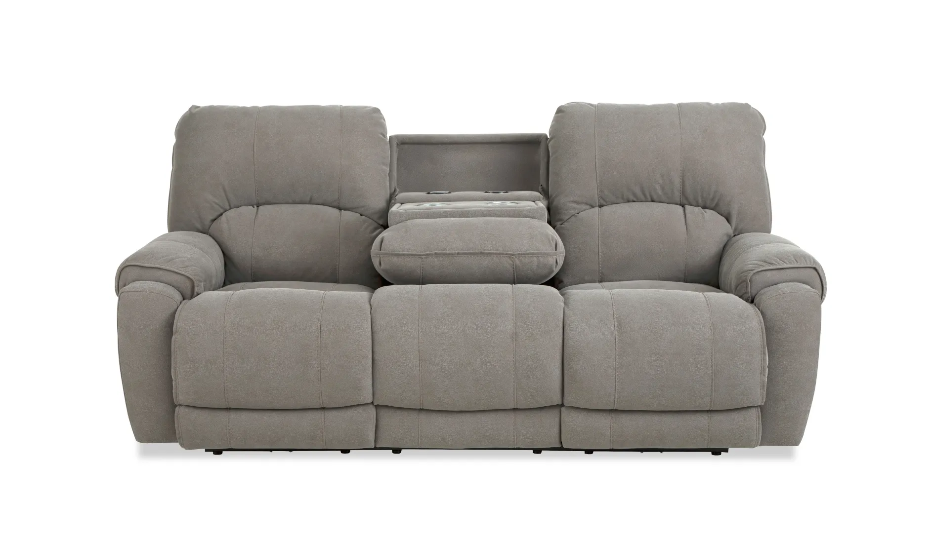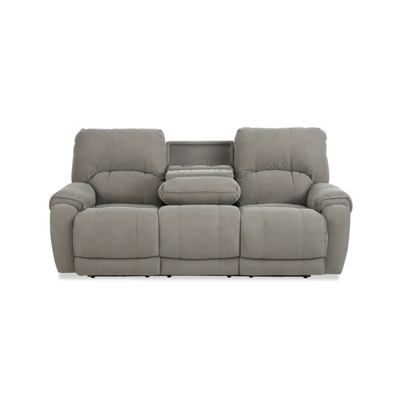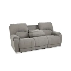 The "Showtime" dropdown table sofa is the perfect combination of comfort and functional style. With a Zero Gravity mechanism that lays flat enough to sleep in, it also features a power headrest (for TV position), power lumbar, and an extended footrest. The dropdown table features cupholders and two wireless chargers, plenty of room for books and electronic devices, or popcorn and snacks for movie night! When not in use, the table folds neatly into the back of the sofa, concealing itself and making room for a third seat in the middle. The Showtime group also features a next-generation double rub cover for 10x durability compared to other fabric upholstery. Make this group your go-to for entertaining, movies, or just relaxing