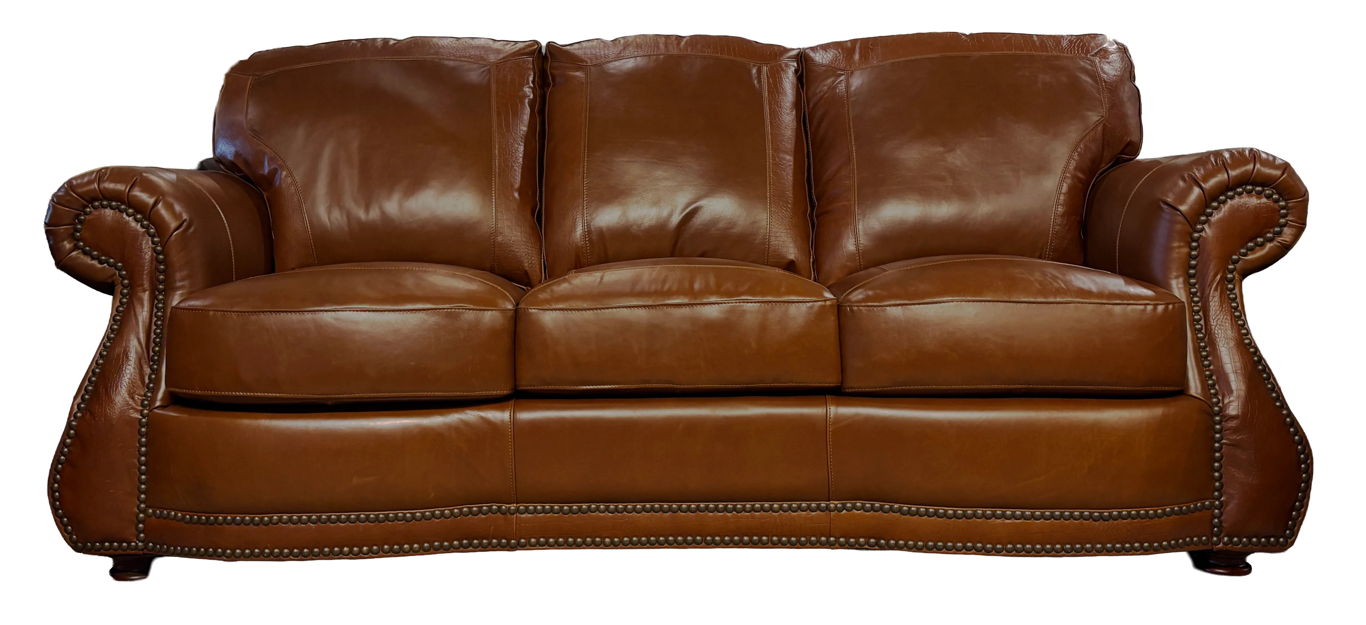 The 9055 features a rolled arm and a high back with alligator embossing on the back pillows, front rail and stump panel. Nailhead trim across the stump panel, back, and front rail completes the look.